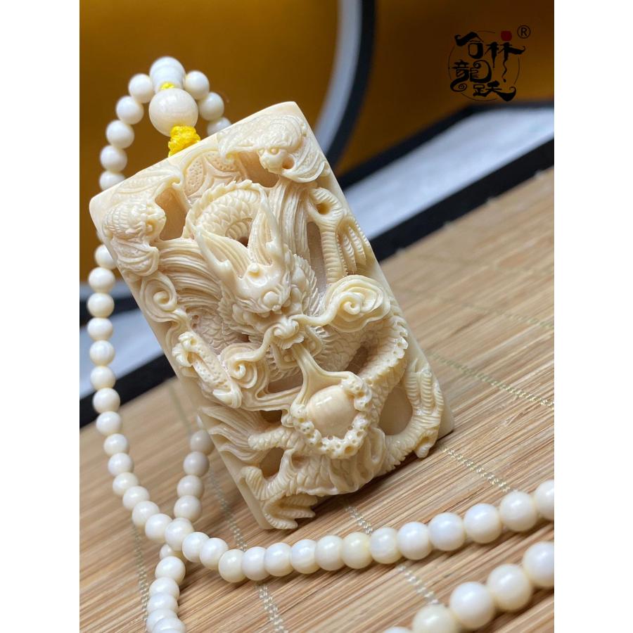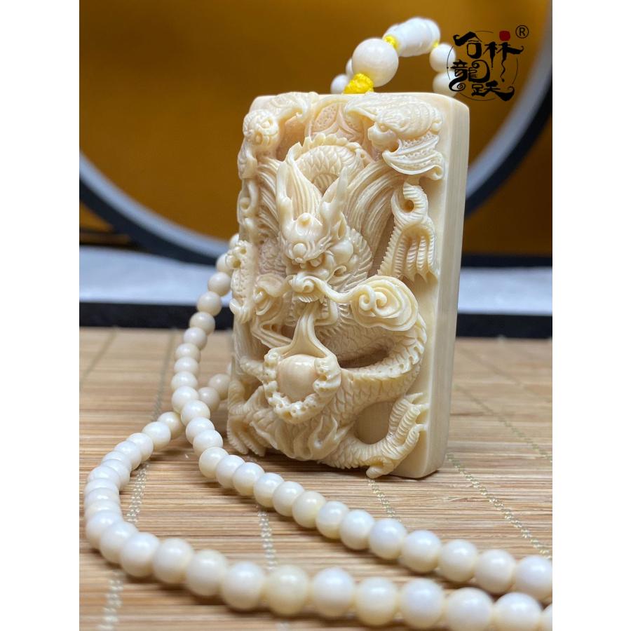 [龍戯珠]ペンダント,厳選した極上のモンマス牙ゼリー材、赤くつやつやしていて、透かし彫りのデザイン、彫刻の繊細さ、吉祥如意、マンモス4mm×168個の数珠を付き。