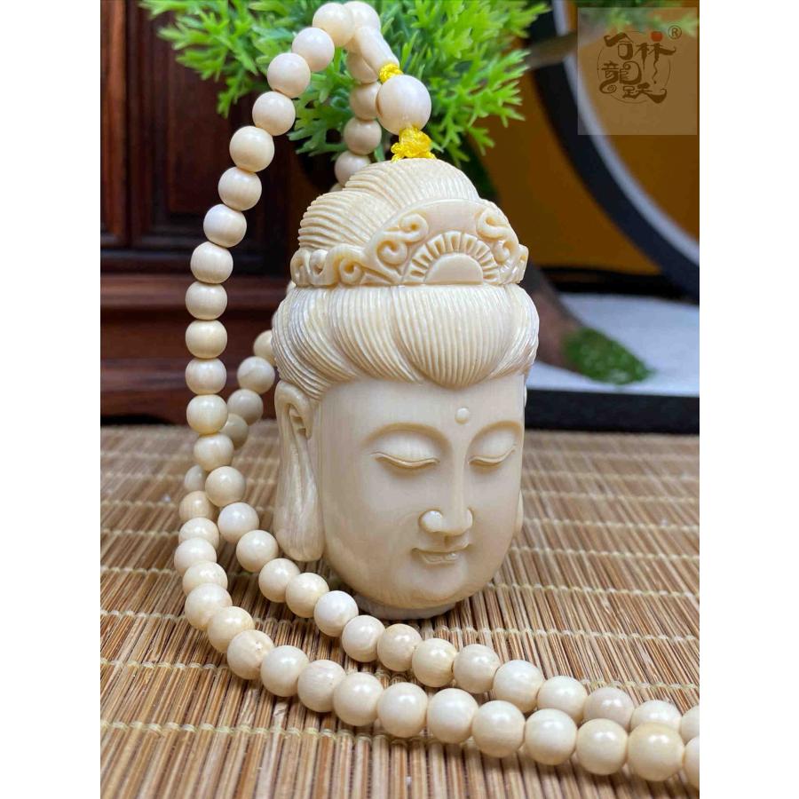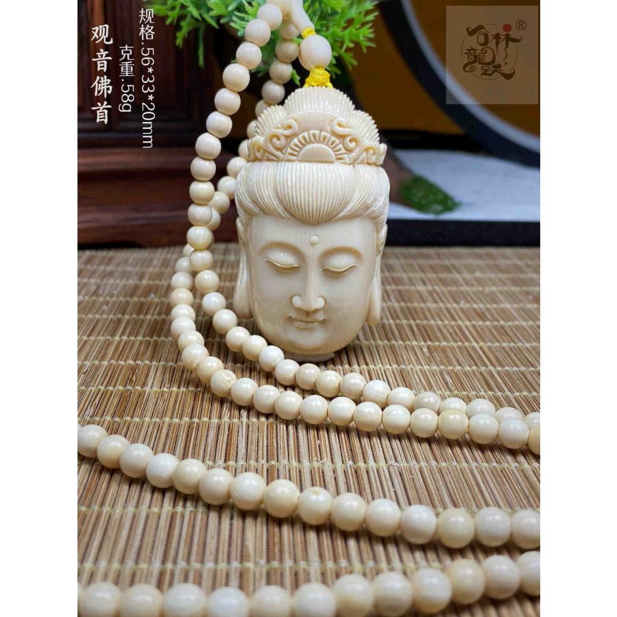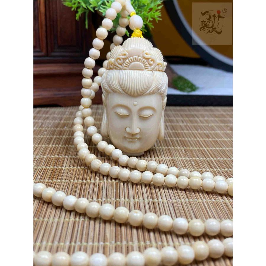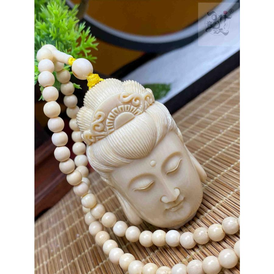 【観音菩薩】ストラップ、牙紋がいっぱいになって、素敵な形、大師匠レベル、純手作り、神態生き生きとした姿、彫刻が美しく、収蔵の宝物です。5mm×128個のマンモスビーズを合わせて!サイズ:55×34×21mmグラム重さ:約58g(手作り彫刻にはわずかな誤差がある)